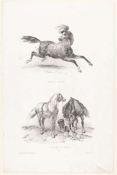 Editor: This is a drawing called "Sketches of a Horse and a Nobleman," its exact date and artist are unknown, and it’s made with ink and pencil on paper. What strikes me is the juxtaposition of these very detailed figures with more gestural, almost chaotic, elements. What do you see in this piece? Curator: The arrangement itself is quite telling. The upper register, dominated by the horse, employs soft, continuous lines, imbuing the animal with a certain elegance. Note how the artist captures the muscular tension through subtle gradations of shading. Now, consider the lower register: the nobleman's portrait is framed within a similarly dark ground as the horse, creating balance. Editor: Yes, I see the tonal balance between the upper and lower images. Curator: Precisely. And have you observed how the textures differ? The horse boasts a polished sheen while the nobleman’s armor shows defined, almost harsh details. The textural contrast gives each subject distinct character, differentiating rank or status. Do you notice how the orientation shifts focus between nature and human? Editor: I didn't quite consider how the artist deliberately varied the mark-making to differentiate these elements. Curator: The formal contrasts invite speculation. The loose grouping of undefined marks on the lower left and the delicate calligraphic marks adjacent to the noble are integral to the artwork's expression, complicating it even further. They’re intentionally ambivalent. They could evoke organic or perhaps even violent associations. What have you gained from this focused approach? Editor: Considering the interplay between the depicted figures and how their visual rendering contributes meaning has offered me new insight into this piece. Curator: Indeed. By understanding formal relationships, we enhance our capacity to extract multifaceted meanings from a composition.