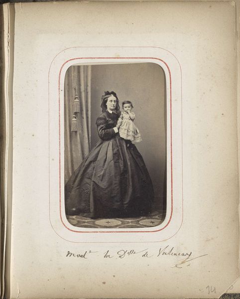 Curator: Disdéri & Co.'s "Portret van twee zusjes De Beaulaincourt," created around 1860 to 1865, showcases two young girls. The print is albumen, part of a larger photographic album. What are your immediate thoughts? Editor: Austere. And intimate, but from a distance. There’s something melancholy in their poses. They stand stiffly, not quite touching. Their dresses, voluminous dark shapes against the pale ground, amplify that solemnity. Curator: The albumen print process itself contributed to this feeling, I think. It required skilled labor to prepare the glass plate negatives and coat the paper. Disdéri industrialized this to produce a massive volume, and it would have been quite a spectacle of labor. Each image carefully posed, carefully printed, part of a larger system of material consumption and cultural production. Editor: Industrializing intimacy... How odd! The image appears very handmade to our modern eyes, especially when you compare it with the deluge of digital snapshots we see now. Look at the details: the subtle variations in tone, the almost velvety texture created by the albumen. Did this somehow commodify sentimentality in a way that allowed those feelings to reach more families? Curator: Exactly. Portraiture before this was only for the elites who could commission painted portraits, right? And these cartes-de-visite, these photographs mounted on cards, suddenly make images accessible to a broader middle class. The consumption of such photos was intrinsically connected to that rise of consumerism. Editor: Still, it makes you wonder about the girls themselves. What was it like to sit there, holding a book you may or may not read, trying to suppress your giggles under the photographer's stern eye? Photography offered people new modes of memorializing. What did it replace in their lives, or supplement? I’m struck by the very human desire to hold on to these ephemeral moments with our loved ones. Even through industrial processes, some feelings, and memories are able to be transferred from artwork to spectator across centuries. Curator: Agreed, even though their poses feel rigid to us, they were pushing back at the technology’s limitations while capturing something universal in the familial dynamic. And I do see in their faces a certain sisterly affection despite everything else you note that may seem rigid. Editor: It certainly adds another layer of depth when you remember this photograph required all those hours of skilled labor. Thanks for shedding light on that today!