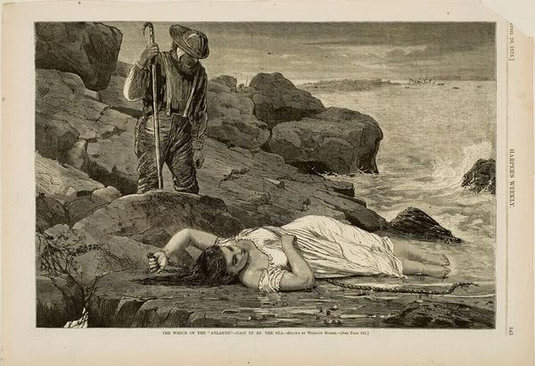 Curator: This is Winslow Homer's wood engraving from 1873, titled "The Wreck of the 'Atlantic' – Cast Up by the Sea." It originally appeared in Harper's Weekly. Editor: It’s undeniably somber. The stark contrast between the figures, the rigid lines depicting the rocks and waves… the overall effect is quite unsettling. Curator: The composition certainly guides the viewer's eye. Notice how Homer positions the standing figure – seemingly a lone survivor – gazing down at the deceased woman, her form echoing the contours of the rocks. The light emphasizes her lifelessness, creating a visual link between the individual tragedy and the vast, indifferent sea. Editor: And think about the cultural context. Shipwrecks were common in the 19th century, particularly off the coast of Nova Scotia where the Atlantic sank. Disasters like this shaped the collective psyche. Homer's image provided a visual record and became a way for a wider public to engage with grief, disaster, and mortality. Harper's Weekly was a hugely popular publication. It gave these tragic events immediacy for its readers. Curator: Absolutely. Consider, too, the medium itself. The precision demanded by wood engraving—every line meticulously carved— lends a sense of unwavering realism to a scene fraught with raw emotion. There is tension here between Homer's intent to illustrate an actual tragedy, and his capacity to elicit sentiment through aesthetic manipulation of shape and line. Editor: Do you think his style, the starkness you speak of, echoes some academic art practices? It does remind me, just a touch, of history painting traditions – though perhaps updated to confront a decidedly more modern, industrial-age catastrophe. This also forces us to recognize the broader systems that shaped these tragedies: class divisions that put some at greater risk, or the rise of transatlantic travel itself. Curator: It also draws in ideas associated with neo-Romanticism because, regardless of its function as a report, the artist transforms the subject by using shadow, line, and subject to engage the audience's emotional sensitivity. The drawing is quite economical, relying on simple compositional and visual elements, yet it carries powerful emotional resonance. Editor: It’s an image that invites both quiet contemplation on death, and a louder examination of our response to human tragedies presented en masse via mass media. Curator: Yes, the scene is carefully arranged so as to be an encounter with death, presented in an impersonal way through careful artistic construction, for an increasingly media-savvy public. Editor: A rather sobering, and perhaps cynical, realization, isn't it?