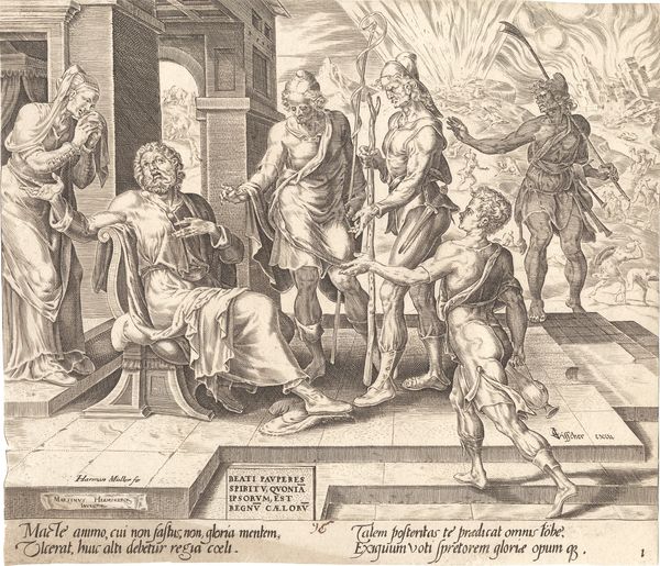 Hendrick Goltzius created this engraving, "The Doctor as an Angel," with meticulous detail. The stark contrast between light and shadow commands attention. The composition is split into two distinct spaces on the left and right, unified by the monumental figure of an angel straddling both. The angel, poised between the earthly and the divine, serves as a visual metaphor for the doctor's role. One side features a scene of comfort and healing, while the other reveals surgery. This juxtaposition suggests a world of illness and health, where the doctor's presence is almost divine. Goltzius uses engraving to explore ideas of care, intervention, and mortality. The artwork isn't simply about the doctor; it's an exploration of our human condition, where medicine and faith intertwine. The formal structure—the balance and the interplay of shadow and light—mirrors the fragile balance between life and death. The interpretation of the doctor as angel and the engraving’s semiotic elements allow for continuous dialogue about the role of medicine in society.