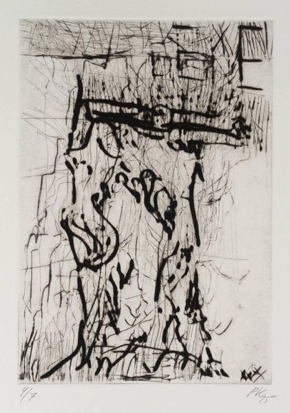 Editor: Here we have Mervin Jules’ "House of Cards." It’s a fascinating print. The figure seems to be building the house itself, which looks incredibly unstable. How do you interpret this work? Curator: Notice how the artist’s hand is directly involved in both the creation of the image – through the printmaking process – and the construction of the house of cards itself. This challenges any distinction between art and labor. The instability becomes a commentary on the precariousness of work and material conditions. Editor: That’s a great point. The process of making the art mirrors the subject of the art. It makes you think about the effort involved. Curator: Precisely. And how that effort is often overlooked in the final "product," whether it’s art or architecture. Editor: I see it now. Thank you for helping me look beyond the surface.
