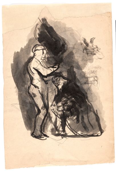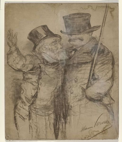 Curator: This is "Drie koppen," or "Three Heads," a drawing in ink by Johannes Tavenraat, dating from about 1840 to 1880, held here at the Rijksmuseum. What are your first thoughts? Editor: They seem burdened, certainly… particularly the face centered at the bottom. There’s a weariness etched into the lines. Curator: Well, notice the quick, almost frantic, linework. You can almost feel Tavenraat experimenting. The support is paper, of course, likely a common, readily available type, hinting at the drawing’s role maybe as preparatory, a moment of sketching before a larger project? Editor: Perhaps, but these faces… they seem to carry a specific weight. That top hat, for instance. In one reading, it might denote aspiration and upward mobility, but there’s also something slightly…off about it, perhaps hinting at a satire of social climbing. Curator: You're focusing on the attire and implied narrative. But consider how the ink bleeds slightly into the paper. What type of ink was he using? What were the environmental conditions of his studio when he worked on this? I bet the consistency of the ink played a role in the rapid, sketch-like quality. Editor: True, the sketch-like quality could certainly stem from the ink, the technology for distribution… However, if we look at the positioning of the faces, there seems to be an internal conversation or conflict visualized here, a symbol perhaps for different states of mind. Curator: That’s an interesting angle, given the era. Though, I'm also thinking of the economics of artmaking at the time and how Tavenraat might have used readily available, cheaper paper precisely for studies like this. Material scarcity drives artistic innovation! Editor: Indeed, but artistic innovation also arises from delving into the human psyche and, as I read it, this piece conveys a somber atmosphere, as though it reveals some unspoken element about humanity. It is so fascinating how he makes the mood so powerfully tangible in a simple, linear, study. Curator: Perhaps the bleak mood is also reflective of the economic conditions from which he drew the support. It does look as though there is slight damage to the support itself... These figures certainly spark multiple ideas! Editor: Definitely. Art draws its meanings both from within and without. A fascinating convergence to ponder!