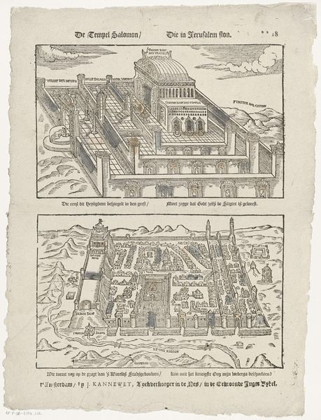 Curator: This engraving, dating back to 1553, is titled "De kerk onder vuur," which translates to "The Church Under Fire." It's attributed to the artist known only as Meester FSW. Editor: My immediate impression is one of chaos. The stark black lines capture a sense of urgent violence against what looks like an institution or fortress, a building riddled with conflict. Curator: Indeed. The composition employs a clear visual hierarchy. Observe the strategic placement of divine figures, juxtaposed against earthly turmoil. This use of line, specifically the delicate hatching, is essential to understanding how the engraver manipulates light and shadow to reinforce symbolic weight. Note also the framing created by the upper celestial band and the lower ramparts. Editor: Looking closer, I'm struck by the details in the battle scene—the primitive war machines, the siege ladder, and even the defensive measures being employed at the entrance. How would these engravings have been made back then and in what quantity? That impacts the value and intended audience and I notice all of the text printed on the building itself. Curator: The inscriptions act as signifiers, reinforcing the narrative, and its didactic purpose, offering a discourse on resistance. Consider the materiality of this engraving: it suggests reproducibility, hinting at broader circulation and its effectiveness as propaganda. Editor: It is interesting how this print mixes the high and the low together. We have the heavenlies and then almost childish instruments of warfare. But look how they are organized around the besieged church. The tools used for creation like chisels and burins must have been simple, but used to create a very complex political piece of agitprop. What sort of resistance do you think it represents? Curator: It is suggestive of the theological conflicts engulfing Europe at the time and suggests an intellectual challenge rather than brute resistance to authority, visible through its emphasis on doctrinal statements displayed on the building's facade. The style references the Northern Renaissance which further indicates intellectual concerns, echoing humanist dialogues. Editor: This analysis makes the print much more vivid to me now. It’s amazing to think how craft intersects with politics. I would never had considered the church under fire could also refer to the clash of beliefs and new ideas. Curator: It provides a lens to the 16th century; form follows meaning and the careful use of symbolic elements directs the viewer's interpretation.
