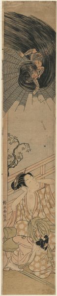 Editor: This is Utagawa Hiroshige's "Woman viewing cherry blossoms" from an unidentified series. The woman's figure is so graceful; what’s your take on the imagery here? Curator: The cherry blossom itself is a potent symbol, isn't it? Its fleeting beauty represents the ephemeral nature of life, a key concept in Buddhist thought. The woman's contemplation mirrors this awareness. Editor: So, her viewing is more than just enjoying the scenery? Curator: Precisely. The cherry blossom can evoke feelings of nostalgia, reflection, and acceptance of impermanence. It acts as a cultural touchstone connecting viewers across time. Editor: That adds a whole new layer to appreciating this artwork. Curator: Indeed! Recognizing the symbols allows us to participate in a long and meaningful visual conversation.