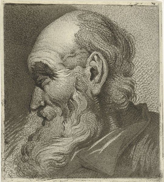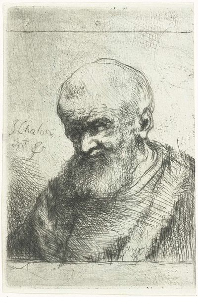 Curator: This etching, "Borstbeeld van een oude man," dating back to between 1625 and 1674 and attributed to Jan Lievens, presents a fascinating subject. The intricate linework captures an evocative image of aging, doesn't it? Editor: It really does! The figure looks world-weary, but also dignified. What I find striking is how the background of simple crossing lines really emphasizes the figure's intense stare. What do you see in this portrait? Curator: This face carries the weight of history. Every wrinkle, every line etched into his face, speaks of a life lived, lessons learned. Lievens offers us more than a likeness. Consider the beard – its texture, its fullness – isn't it suggestive of wisdom, experience accumulated over decades? The direction he is looking also invites the audience to look ahead to the future. Editor: That makes me think about how, even though this is one man, he could be seen to represent all older men, a stand-in for their collected wisdom? The everyman, perhaps? Curator: Precisely. His anonymity becomes his strength. But observe how Lievens uses light and shadow. Where does your eye fall first? Editor: Probably his eye or cheek… those are the darkest, most defined areas. Curator: Notice how those areas aren't simply dark, but convey character, insight. These details root him in a specific time and place, a Golden Age perhaps, but the archetypes still reverberate across the centuries. Editor: I hadn't thought of it that way, focusing less on the subject's immediate context. Thanks! Curator: Consider how these images act as mirrors reflecting back our own understandings and memories. Art helps us build those cultural continuities. Editor: Thank you for sharing that perspective!