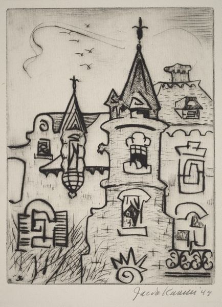 Editor: Here we have Julian Trevelyan's print, "Etruria." It depicts a pottery factory with workers and kilns. I'm struck by how much the process of making pottery seems integral to the whole composition. What does this piece say to you? Curator: For me, "Etruria" speaks volumes about labor and industrial production. Trevelyan highlights the repetitive, physical work inherent in pottery manufacture. Notice how the workers are depicted almost as extensions of the kilns themselves, their bodies directly involved in the act of production. Editor: So, you're saying the print emphasizes the material conditions and the physical act of creation? Curator: Precisely. It invites us to consider the social context and the human element within the seemingly detached world of industrial processes, bridging the gap between art and labor. Editor: That really shifts my perspective! I was initially focused on the artistic style, but understanding the social context makes it much richer. Curator: Exactly, looking at the means of production invites us to reconsider the value we place on both the art object and the labor that creates it.