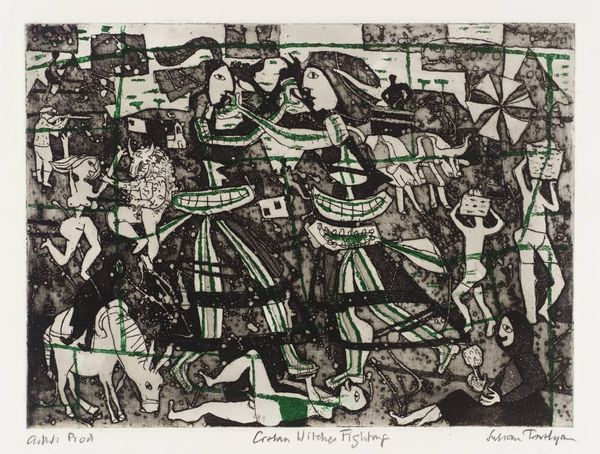Curator: Julian Trevelyan's "Les Baux," part of the Tate Collections, presents such an interesting case of modernist printmaking. Editor: Immediately, I'm struck by its whimsy! It feels like a stage set for a very stylish, slightly absurd play. Curator: Yes, the etching technique lends itself to that theatrical feel. Notice the layering of textures, creating depth but also flatness, challenging the viewer's perception. Editor: I love how the limited palette—mostly black, white, and this unexpected teal—creates such a bold statement. It’s playful, like a child's drawing, but also sophisticated. What do you think about that sun? Curator: The sun, or perhaps the moon, is a key element in grounding the composition. It also highlights Trevelyan's mastery of intaglio, demonstrating a keen understanding of surface and ink manipulation. Editor: I feel I can imagine the figures walking toward Les Baux; it makes me think about how art transforms space and location. Curator: Absolutely, and Trevelyan’s work reminds us of the value found in experimenting with traditional methods. Editor: A truly unforgettable little world captured in print!
