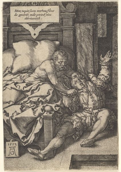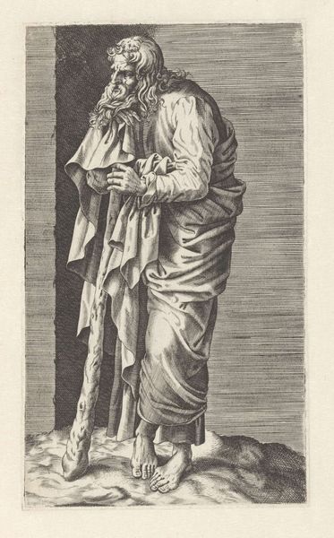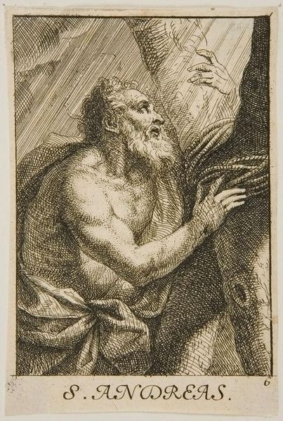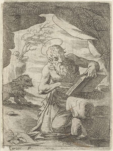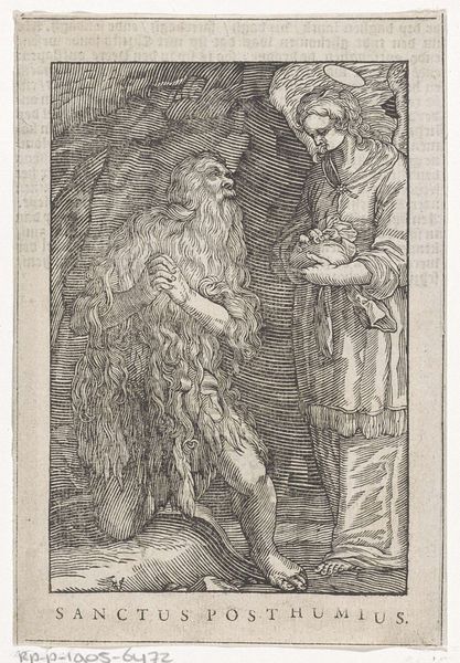 Editor: This is "Heilige Onyphrius de Grote" made between 1590 and 1619 by Boëtius Adamsz. Bolswert. It's an engraving. I find the stark contrast and detailed lines really draw me in, creating a somber but reverent mood. What do you see in this piece? Curator: The image resonates with echoes of earlier iconography depicting hermits and saints. Notice how St. Onuphrius is depicted: covered in hair, kneeling in what appears to be a cave. These visual elements are not arbitrary; they tap into a pre-existing cultural memory of asceticism and withdrawal from society in pursuit of spiritual enlightenment. Editor: That makes sense, but I am curious about the figure standing next to him, bearing gifts of some kind. Is it an angel? What does it mean? Curator: Indeed it is. Angels often represent divine intervention and grace. In this image, the angel’s presence suggests a compassionate acknowledgement of Onuphrius’s devotion. The objects the angel carries, possibly dates and bread, become powerful symbols of sustenance – both physical and spiritual – in a barren landscape. Editor: So, the barren landscape emphasizes Onuphrius’s isolation and dependence on divine provision. Is that fair? Curator: Precisely! Furthermore, the dark cave juxtaposed with the angelic light could represent the internal struggle and the eventual illumination that faith can bring. Look how Onuphrius' gaze is directed upward; it signifies his connection with something greater. Editor: The engraving style definitely enhances that feeling, too. It's almost like the darkness is being pushed back by faith. Thanks for helping me unpack all those layers. Curator: It is my pleasure. The endurance of visual symbols to articulate narratives is certainly compelling.
