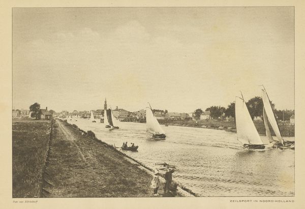 Curator: Looking at this fascinating albumen print from the 1860s entitled "[Civil War View]", the artist Thomas C. Roche captures a waterside scene in a way that I find quite evocative. Editor: Immediately, I'm struck by the feeling of somber stillness, even emptiness, conveyed by this photograph. The hazy light and the muted tones amplify the image’s introspective nature. What’s happening beyond the captured image, do you think? Curator: As a "view" rather than a clearly defined locale, this Civil War era albumen print speaks to me of the infrastructural impact. Consider the material constraints and available processes. Roche, utilizing readily available technologies of the time, creates a detailed record through the albumen process—glass plate negative, contact print on paper, treated with egg whites and silver nitrate. The print itself becomes evidence of that practice. Editor: That's a wonderful way to consider it, but consider the symbolic nature of the water and boats during wartime. Water often represents the flow of time and change, doesn't it? Here, with a war as its context, doesn’t it seem like the boats take on a heavy meaning? Vessels of transportation, yes, but possibly alluding to the movement of resources, of soldiers, perhaps even of hopes? Curator: The way you interpret that as directly referencing to the conflict is astute. But isn't it about more than simply content or allegorical weight? This photograph, this object, is the outcome of tangible industrial operations—the paper mill providing stock, the chemical suppliers furnishing nitrate—all are factors. Editor: Yet the placement of those ships, their quiet postures; don’t they evoke a sense of cultural pause amidst a period of tremendous upheaval? Even their very existence relies on readily available natural materials from felled trees... Curator: Right, everything returns to the natural materials needed to make the war machines *and* artistic documentations! But this process emphasizes that labor *creates* value. Here's a visual encoding of societal conditions expressed directly onto the material itself. Editor: Thank you, understanding that aspect adds more. Seeing these common, shared symbols through this lens of materiality, production, and war generates a compelling perspective on cultural memory. Curator: Yes, and it's through acknowledging this interdependency of factors that historical artifacts communicate the intricacy and magnitude of change over time!