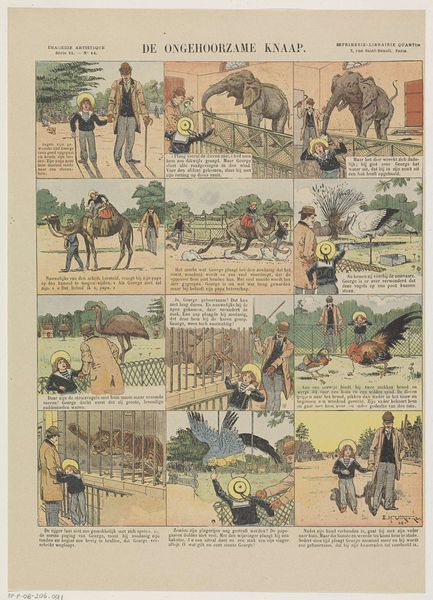 Curator: Let's turn our attention to "Buitenleven," created in 1874 by De Ruyter & Meijer. It’s a rather charming color print, comprised of several vignettes offering glimpses into Dutch rural life. Editor: My first impression is pure nostalgia. It feels like peering into a child’s storybook. The color palette is soft, and there's a definite air of idyllic charm about each little scene. Curator: Exactly. The work serves as both narrative art and a glimpse into a genre painting, depicting idealized moments. Think of the era, industrialization was advancing, but this image offers a counter-narrative focusing on the timeless, agricultural Dutch countryside. The figures performing everyday tasks within small frames are reminiscent of a comic strip almost. Editor: Absolutely. And notice the medium: It's a print, likely mass-produced. These images would have been very accessible to a wide audience. Also consider the emphasis on labor: we see farming, tending livestock, and the everyday realities of rural work. It's not romanticized, but straightforwardly presented. Curator: I agree. It presents a constructed image of wholesomeness and the traditional Dutch family values during the period. It acts as an escape from urban realities while perpetuating ideas of Dutch cultural identity that remain influential today. Editor: I am struck by its implicit contrast between the industrious agricultural lifestyle shown in contrast to comic elements and possible childhood antics. It reflects an ideal tied into the economy of labor that both preserves an element of freedom alongside everyday duty. Curator: Perhaps a deliberate message regarding work, social values, and family for the intended audience? And, because these were printed, it makes this art incredibly portable, like small propaganda almost. Editor: Interesting, certainly something to think about in our own present consumption of imagery and production of culture through visual media. Curator: I agree, this piece made me rethink ideas of a national heritage rooted in labor, agriculture and domestic life, during times of changing social mobility.