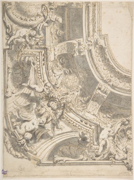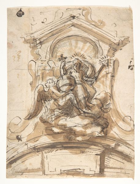Editor: Here we have Pieter Verbruggen the Younger's "Design for a sepulchral monument with a seated female figure," created sometime between 1686 and 1724, using pen, pencil, and ink. The sketch, it's almost haunting, a whisper of something grand and somber. What stands out to you? Curator: Haunting is the perfect word. It evokes not just death, but memory. The seated female figure—lost in thought, or perhaps grief. Notice how Verbruggen hasn't defined her with sharp lines but lets her almost dissolve into the architectural setting. Do you see that asymmetry, how the monument seems to be both rising and crumbling? Editor: Yes! It's like it’s simultaneously being built and decaying. Is that intentional? Curator: Absolutely. The Baroque period reveled in that tension—the grandeur and the transience of human achievement. It is the earthly versus the divine, a sort of theater in the round of the brevity of life itself. And the 'verso' having a standing male and piece of a letter...It speaks volumes without really telling us anything! Do you think the artist found inspiration in the everyday experiences that might be revealed in a simple letter? Or perhaps it suggests that monuments and art were born through hard labor, creative drafts, personal exploration, and communication? Editor: That makes me wonder about who this monument was intended for and what that incomplete letter contained. All these fragments pointing to a larger, lost narrative. It gives the piece an added layer of complexity. I initially just saw a sketch of a monument. Now I see stories lurking beneath the surface. Curator: Exactly! Art's true magic trick isn't in what is visible, but in how it tickles our imaginations into building meaning of our own! Now if you’ll excuse me, I must go see what my own 'verso' has in store.