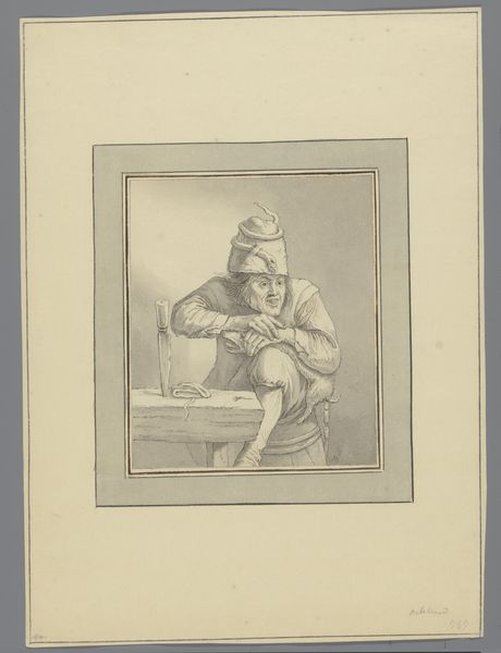 Curator: Immediately striking, isn't it? "De Smulpaap," or "The Gourmand," is an engraving that dates roughly from 1700 to 1800. Editor: My first thought: It's wonderfully grotesque! The expression on the subject's face, that maniacal grin… and the texture rendered in such fine lines adds to a heightened sense of greed. Curator: Precisely! And what does the gourmand grasp so tightly? The large pitcher serves not just as a container but becomes an extension of himself. Historically, these images capitalized on caricatures, providing viewers ways to playfully—or perhaps critically—reflect on themes like pleasure, moderation, and self-control. Editor: Indeed, the oval frame sets a stage. Observe the background pattern; its intricate detail pushes the subject forward while framing them as spectacle—almost like a specimen pinned in an entomological collection, to be studied. Do you see how the lines deepen in shadow around his features and that potbelly form? Masterful depth created through pure line work. Curator: Consider also the hat, casually yet distinctly placed, as a symbolic element. Its non-traditional form disrupts conventional expectations. And consider that this dates from a period of expanding merchant wealth. Was this meant to mock newly-rich members of society? I can't help but think it has echoes to works like depictions of "gluttony" throughout Medieval art. Editor: Ah, yes. The composition even hints at the baroque tendency toward theatricality. Though printed in monochrome, it manages to convey such lush volumes. The engraving rewards deep viewing; its very precision underscores the themes. Curator: It speaks, in a small yet profound way, about our collective memories around ideas of overindulgence and societal norms. Thanks for walking with me through the images it brought up! Editor: The pleasure was all mine!