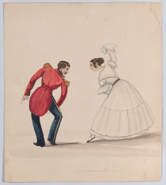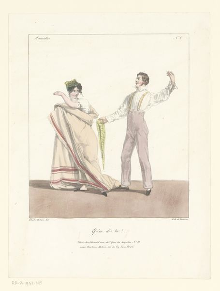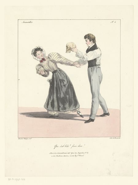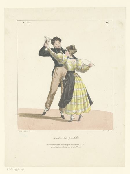 This lithograph by Charles Philipon captures a dancing young man and woman with dynamic energy. The composition immediately draws the eye to the figures, poised mid-movement against a muted background. The artist uses line and form to convey a sense of lightness and rhythm. The bodies are rendered with delicate outlines, suggesting volume through subtle shading and light washes of color. Consider how the upward lift of their arms and the tilt of their bodies create a diagonal thrust, suggesting the fleeting, temporal nature of dance. Philipon employs a limited color palette, but each hue is carefully placed to balance the composition. The man’s light trousers contrast with the darker tones of the woman’s dress, creating a visual interplay that enhances their interaction. The textures, though subtly indicated, add depth to the scene, from the polka dots of the man's jacket to the soft folds of the woman's skirt. These choices in structure and form not only depict a dance but also encapsulate the fleeting nature of movement itself. They remind us that art is not just a representation but an experience that invites us to reflect on time and motion.
