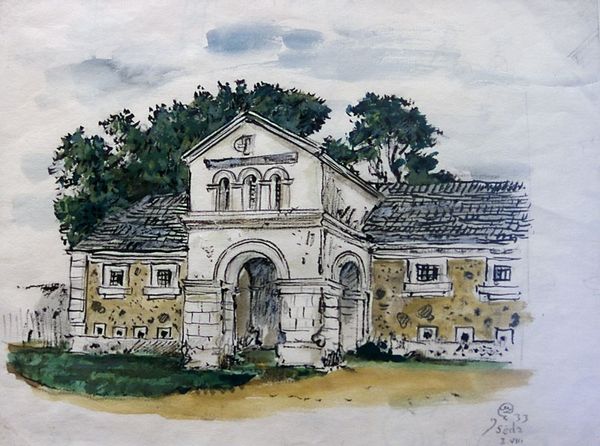 Editor: Here we have "The Larin's Garden. Sketch of set for P. Tchaikovsky's opera," an oil-on-canvas piece painted in 1908 by Konstantin Alexeevich Korovin. The colours feel quite muted, and it strikes me as a very traditional garden scene. How would you interpret this work? Curator: Well, it's interesting to consider this piece as a stage set design. Korovin was deeply involved in theatrical design. Does knowing it was a set sketch change how you see it, considering how Russian opera staged national identity? Editor: It does, actually. The building seems more staged, more deliberately constructed. But how does a stage design inform identity? Curator: In this period, the visual culture of theatre often reinforced ideas about Russian heritage. The specific architecture chosen, even in sketch form, conveys certain cultural associations. How do the architectural elements strike you? Do they evoke a specific time? Editor: I suppose the columns and symmetry hint at a sort of idealized Russian past, maybe a noble estate? I can see that aligning with the opera's themes. Curator: Exactly. Korovin is not just creating a backdrop, but contributing to a broader cultural conversation. And even the impressionistic style, breaking from academic painting, plays a role in shaping the perceived authenticity. How do you mean, it suggests the 'real' Russia is not perfectly, academically representable? Editor: That makes sense. The sketch feels less like a literal representation and more like a feeling of Russia. I hadn't considered the stylistic choices as also reinforcing a cultural idea. Curator: Precisely! So, next time, when you're viewing any artwork, remember to always look for context and understand its role in the society in which it was created and in shaping identity. Editor: Definitely! This gives me so much to think about in terms of the choices artists make to communicate cultural values, even when they're seemingly "just" painting scenery.
