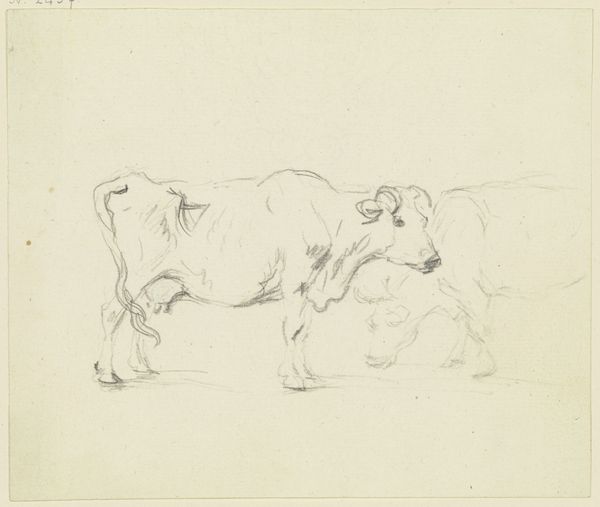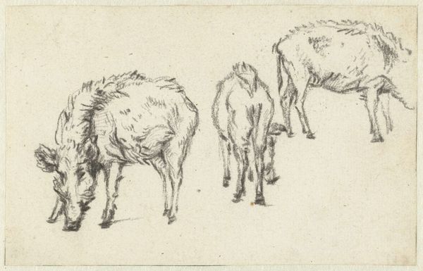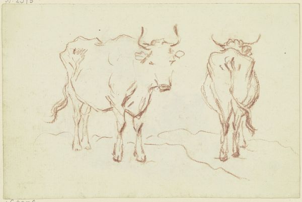 Johan Daniël Koelman made this drawing of oxen pulling a plough using graphite on paper, sometime in the mid-19th century. The artist has used graphite to capture the weight and texture of the animals' hides and musculature, in contrast to the simple agricultural equipment attached to them. You can imagine the amount of physical labor, both human and animal, required to work the land during this period. Koelman, though trained in the fine arts, has here taken on the task of documenting the daily life of laborers and their animal counterparts. Consider the cultural significance of this subject matter at a time when industrialization was beginning to transform agricultural practices. Drawings like this remind us of the connection between art and social context. They challenge traditional hierarchies that separate 'high' art from the everyday realities of labor and production.