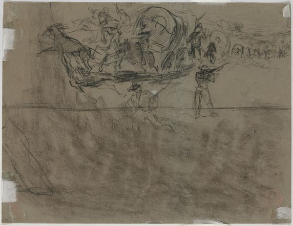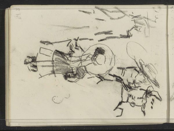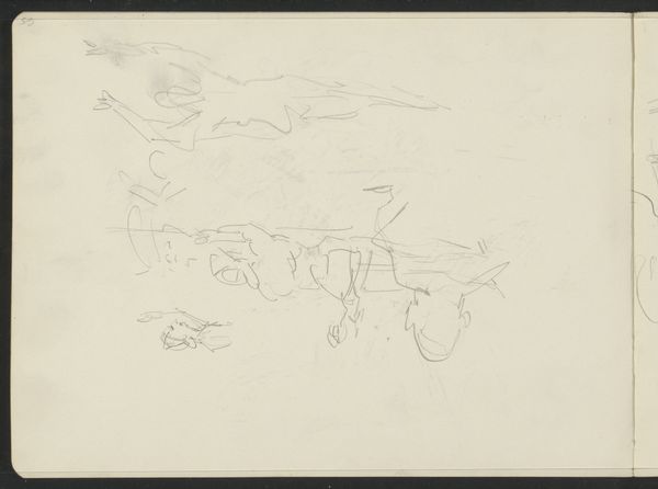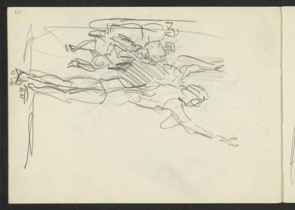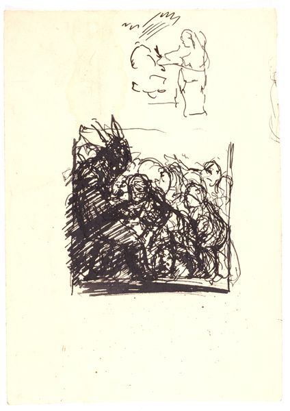 Editor: This is "Compositiestudie," a pencil and pen drawing by George Hendrik Breitner, created between 1881 and 1883. I’m really struck by the ambiguity. It feels almost dreamlike, but also kind of tense. What do you see in this piece, particularly in terms of symbolism? Curator: It’s interesting you use the word dreamlike. I see it less as a landscape and more as a map of the mind, in particular of someone steeped in 19th century cultural memory. The roughly sketched figures – notice the implied dynamism even in the stillness – evoke both classical statuary and contemporary street life. Consider how pervasive both images were and still are! Editor: So you're suggesting these aren't just figures, but loaded symbols of different eras, existing simultaneously? Curator: Exactly. The sketchwork, almost frenetic, reminds us that cultural memory isn’t a static thing. It's constantly being renegotiated, fragmented, and reassembled in our minds. Even the medium itself – pencil and pen, tools of study and record – speak to the act of archiving and interpreting the past. Notice the way the figures appear contained but are overflowing with their sketchy medium. Does that convey any specific emotional reaction for you? Editor: Definitely. The container implies a defined structure and that tension creates a restless feeling. I never thought a simple sketch could be so rich with ideas. Curator: Breitner uses such economical strokes to build up symbolic density. He reminds us that every image, no matter how fleeting, carries a cultural and psychological weight. What do you think of that going forward, considering our reliance on quick images nowadays? Editor: It definitely challenges me to think more deeply about what images are, and what memories we're building and carrying. Curator: Indeed, It gives one pause to consider.