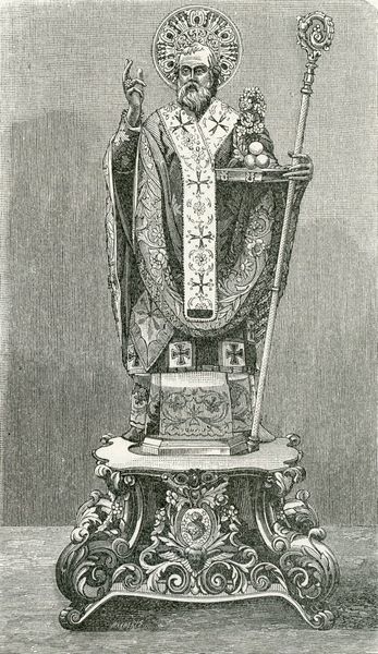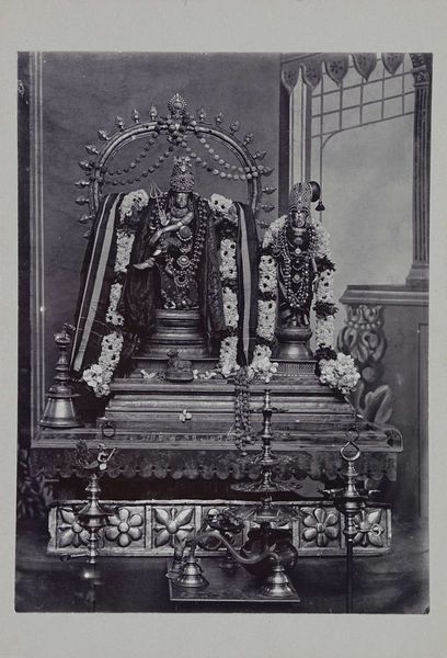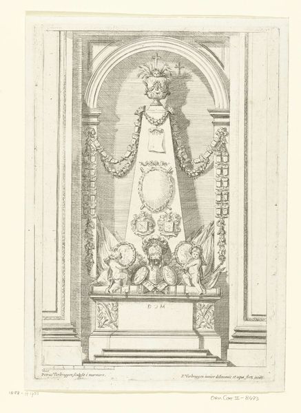 Curator: This print depicts the "Monumento a San Gennaro Nella Chiesa Di Montevergine," created in 1898 by Giuseppe Barberis. The medium is an engraving, capturing what appears to be a sculpted bust. Editor: It has a stern, imposing presence. The stark contrasts of the engraving certainly emphasize the weight and formality of the depicted sculpture and architecture. The engraving does lack detail however and makes me want to view the actual work. Curator: Indeed. Looking closely at the printmaking, the varying line weights likely try to represent the original monument's texture and volume. I wonder what kind of stone the sculpture would have been made of. And what labour and craftsmanship went into creating this ornate setting, as the engraving also suggests architectural complexity. The material properties impact our perception of this image greatly. Editor: This sculpture likely plays a crucial role in reinforcing the authority of the church and promoting the veneration of San Gennaro within the religious community of Montevergine. Barberis' decision to capture the monument serves to broadcast its significance and imbue it with renewed importance through distribution of the work as print, reinforcing public devotion through access. Curator: I find the contrast between the holy figure and the materials they likely utilized fascinating. From precious metals, possibly gold thread within that hat, to pigment used to paint and illustrate their importance—how did this labour and access to materials create social structure at the time, and support belief systems materially? Editor: Certainly a thought-provoking piece. It brings up broader questions about art’s function in promoting power, shaping cultural memory, and influencing public perception, something particularly important considering religious shifts at the end of the 19th century. Curator: Absolutely. Analyzing the artwork this way brings the craftsmanship to the foreground and shows a deep investment of physical, cultural, and spiritual labor. Editor: A poignant insight; the image reveals that artwork is, in effect, more than merely aesthetic experience but a kind of historical argument through imagery, material, production and display.