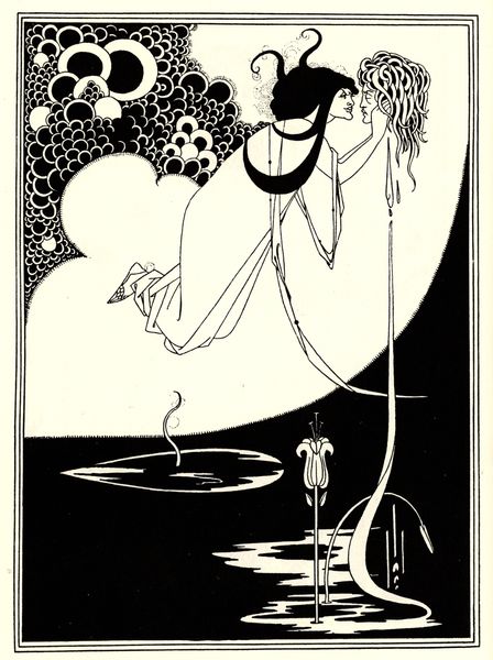 Aubrey Beardsley created "The Platonic Lament" as an ink drawing, characteristic of the decadent aesthetic prevalent in the late 19th century. Beardsley, working within the aestheticism movement, sought to liberate art from moral constraints, exploring themes of eroticism and mortality. The drawing shows the artist's preoccupation with classical mythology and gender dynamics. We see a female figure draped across a bed, above her, a geometric tower engulfed with vegetation. The figure's melancholic pose and the presence of a grotesque, almost goblin-like character hint at the complex interplay between desire and disillusionment. Beardsley challenges Victorian ideals of femininity through the figure's sensual depiction and the subversive undertones of the scene. The platonic love is almost a performance, a recognition of something forever out of reach, and something to despair. This drawing captures the intensity of emotions while questioning the boundaries of societal norms.