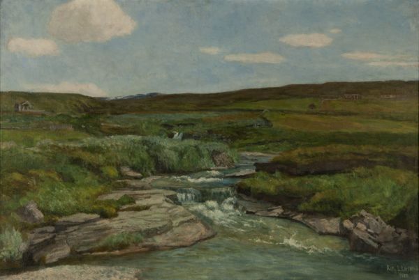 Henry William Banks Davis captured this serene landscape with oil on canvas, sometime during his lifetime. Notice how the water dominates the foreground, its gentle flow inviting contemplation. Rivers, throughout art history, aren't merely bodies of water. They are symbols of life's journey, ever-flowing and changing. Think of the ancient Greeks who saw rivers as gods, like Oceanus, the great, all-encircling river. Similarly, in Chinese landscape painting, water embodies vital energy, Qi, animating the scene. Even the act of crossing water appears in different contexts, from the ancient Egyptians journey to the afterlife navigated by boat, to the river Styx in Greek mythology, a boundary of the underworld. This motif, laden with psychological weight, taps into our collective consciousness, evoking themes of transition, purification, and the passage of time. So, let the sight of this painting and its flowing river remind you of the timeless cycle of existence.