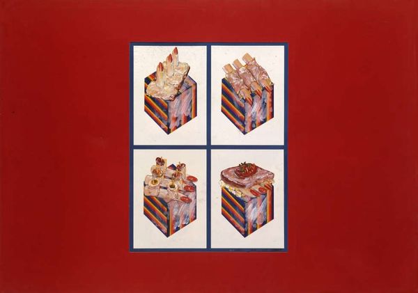 Editor: Here we have Jack Gould's "Untitled (avocado soup and fruit in goblets)." The dimensions are 10.16 x 12.7 cm. The composition is arresting, almost staged. What strikes you most about this image? Curator: The interplay of textures and forms is quite deliberate. The hard lines of the silverware juxtapose against the soft, rounded forms of the soup and fruit. Notice the chromatic tension between the cool greens and the warm red backdrop. Editor: So the tension between the colors and shapes creates the structure? Curator: Precisely. The artist uses these formal elements to guide the viewer's eye and create a dynamic visual experience. The light reflects off the glass, creating an intriguing depth. Editor: I see that now. It’s interesting how much you can interpret just by looking at the forms and colors. Curator: Indeed. The artist's intentional manipulation of these elements is what gives the work its power.