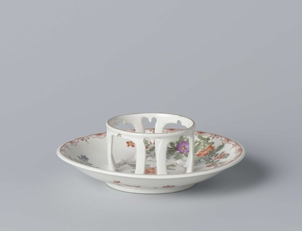 Editor: So, here we have a cup, "Kop, beschilderd met bloemtakken," from around 1778 to 1782, made by the Loosdrecht manufactory. It's porcelain and earthenware painted with floral motifs, currently at the Rijksmuseum. I’m struck by its delicacy and the way the flowers seem to almost float on the surface. How do you approach interpreting something like this? Curator: It is crucial to observe how the decoration articulates with the form. Notice the sinuous curves of the rococo style, manifested both in the shape of the cup and the painted floral sprigs. The subtle asymmetry creates a sense of dynamic movement, wouldn’t you agree? Editor: Absolutely. The arrangement of the flowers feels very natural, not at all stiff. What’s your perspective on the color palette? The blues and oranges work so well together. Curator: Precisely. The contrast between the cobalt blue and the iron-red creates a visual tension that enlivens the piece. It's not merely representational, but also an exercise in color theory. Consider, too, the subtle gold trim which frames the piece and lends definition. Where do you think it adds to or takes away from the experience of the whole? Editor: It accentuates the whiteness of the porcelain and sort of elevates it, doesn't it? Before, I was seeing just a cup and saucer. Now I see this interesting composition of line, color and form. Curator: Indeed. By carefully considering these elements – form, colour, decoration – we appreciate not only the craftsmanship but the underlying aesthetic principles at play. Editor: Thanks for helping me view art in new way, I think I am going to pay more attention to the arrangement and colours now. Curator: And by doing so, you come ever closer to understanding the heart of art!