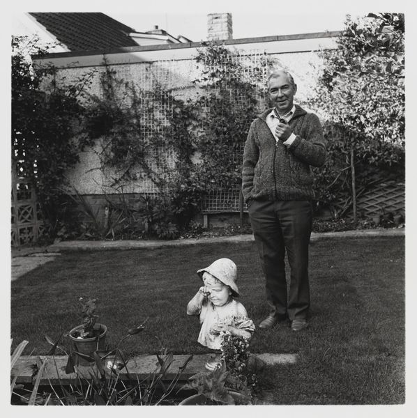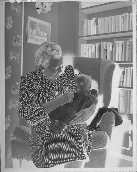 Editor: This is an untitled photograph by Martin Schweig, portraying an older man with a child. It's an intimate scene, yet the high contrast creates a sense of distance. What can you tell me about this piece? Curator: This photograph raises several important questions about power dynamics, representation, and visibility. What narratives are being constructed here, and whose stories are left untold within the frame of domesticity and generational legacy? What does this image tell us about inherited privilege? Editor: That gives me a lot to think about. Thank you. Curator: My pleasure, it is important to consider the social fabric that underpins artistic expression.