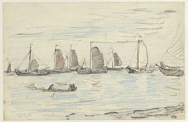 Curator: Looking at this etching titled "Vissersvloot op de Maas," or "Fishing Fleet on the Meuse," made by Carel Nicolaas Storm van 's-Gravesande, likely sometime between 1851 and 1902 and now held here at the Rijksmuseum, what is your initial read of it? Editor: There's a remarkable stillness, almost a somber mood, evoked by the soft gradations of gray. Despite depicting numerous fishing boats, there’s little sense of bustling activity. They're ghosting along the river, sailing into the past. Curator: Indeed, it is a scene imbued with tranquility. But what is so powerful, for me, is how Van 's-Gravesande manages to depict a sense of timelessness in the scene. Editor: Absolutely. Fishing fleets have sailed rivers for centuries, but the specifics—the type of boat, the hint of industry on the distant shore, maybe even the cut of the sails – subtly situate this within a particular socio-economic framework. Were there major changes in fishing practices at this time on the Meuse? Curator: The rise of industrial fishing certainly began impacting smaller, traditional fleets, leading to shifts in maritime communities. The artist himself lived through a period of immense transformation. I wonder, were the fishing boats used as symbolic reference to the cultural memory of Dutch maritime power? Editor: It’s possible. Remember that marine painting was already loaded with nationalistic fervor. Choosing such a subject, particularly one that seems on the cusp of disappearing, lends itself to a certain politicization of imagery. And these etching techniques evoke an interesting dynamic; this imagery creates reproducible forms that become very impactful when discussing history. Curator: Certainly, this work creates a layered cultural understanding; how technological and political histories interweave, becoming ingrained and emotionally significant. Editor: Ultimately, this image makes me consider the legacy of the working class. These industries and labors become markers of a unique heritage; a shared, maritime, history of the Netherlands. Curator: Thank you for the valuable points. I am also left pondering the continuity of symbols and culture. The water element for one becomes a link; connecting humanity across centuries, mirroring transformations while retaining foundational symbolism. Editor: Yes, a shared understanding that art can act as a carrier for political sentiment. I hadn’t quite understood that until this moment.