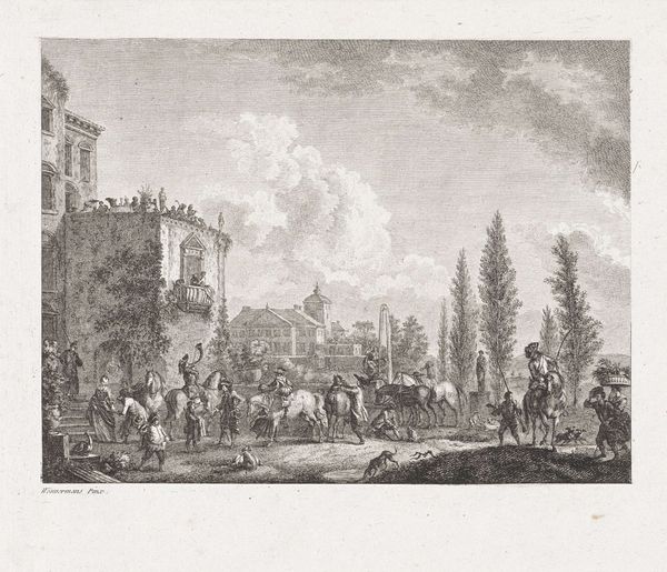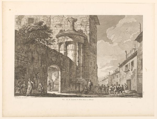 Curator: Ferdinand Kobell’s etching, "Fountain in Front of a Ruined Tower," presents us with a scene steeped in history. It looks quite serene, but also a little melancholic. Editor: Indeed. The etching technique, I think, allows Kobell to explore textures and the decay of materials in the architecture and the fountain, which are central to the composition. The ruined tower juxtaposed with the everyday life surrounding the fountain shows consumption habits, access to water, trade... Curator: I love the way the figures are positioned around the fountain, you almost hear sounds, human and animal movement, that are not actually there in the landscape, it's all so engaging. Editor: Right, those figures give life to this moment in time, and through process we can understand how art making captures the essence of an era. Curator: It leaves me with a feeling of wanting to know more about the people in this square, their stories, their lives. Editor: And for me, a deeper understanding of the historical and social context, through the materials and techniques.
