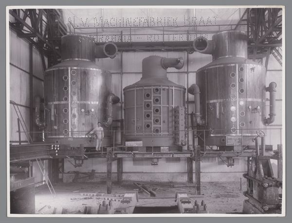 This photograph shows a still with three cooking pans and two evaporator bodies, and was made at an unknown date, by an anonymous photographer. While the artist is unknown, we can see through the material and processes involved, the culture in which it was made. The industrial materials and their arrangement speak volumes about their moment in time. The steel bodies loom large, bolted together and ready for work. The photograph captures an industrial scene, which is likely dedicated to the production of alcohol. It represents the kind of specialized equipment that drove industrial economies. Each component, from the riveted panels to the gauges and valves, shows human labour, from the factory floor to the engineers office. The scale of the still suggests a substantial operation, geared toward mass production and widespread consumption. Paying attention to the materials and making helps us recognize the social and economic forces at play, and understand the world that brought it into being.