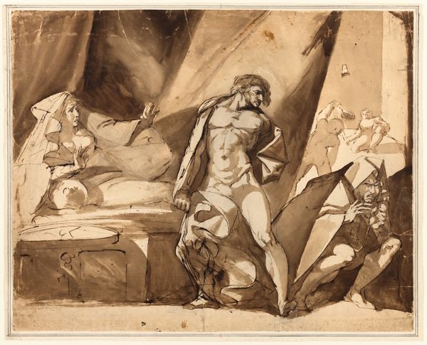 Editor: Here we have "Drunken Silenus, Satyr, and Nymphs," a drawing by Nicolas Poussin, date unknown, created with ink, chalk, and charcoal on paper. The earthy tones and chaotic, celebratory scene give off a distinct sense of unrestrained merriment. What is your take on it? Curator: Merriment indeed, like a boisterous bacchanal captured in shades of twilight. The way Poussin uses light and shadow is just…*chef’s kiss*. See how the figures emerge from the landscape, all tangled limbs and mischievous grins? It's not just a depiction of drunken revelry; it’s an exploration of humanity's primal urges, right? Do you notice anything peculiar about Silenus? Editor: You’re right, it’s incredibly dynamic! And Silenus looks like he’s about to spill his drink all over himself. I wonder if Poussin meant it as a cautionary tale about excess? Curator: Perhaps! Though Poussin wasn’t usually one for simple moralizing. I think he was more interested in capturing a raw, almost violent energy. A kind of…release. I get this swirling vortex kind of feeling. Does it make you feel that, even just a little? Editor: It does. The sheer mass of bodies almost overwhelms the landscape. Like a force of nature in themselves. It’s like the classical world’s version of a massive frat party. Curator: Exactly! A perfect storm of classical myth and earthly indulgence. Looking closer makes you question just how composed it actually is, doesn't it? Editor: Totally! Thanks; that changed my view entirely! Curator: That’s what’s great about art, right? Changing perspectives one tipsy Silenus at a time.