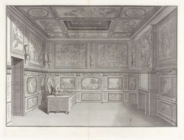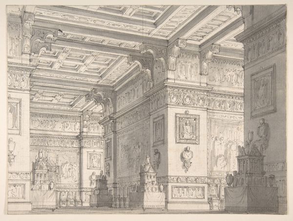 This architectural design drawing of an interior was made by C. Taselaar with pencil and ink. The drawing meticulously shows the interior of an imagined room, complete with wall decorations and large windows. The lines are precise, and the shading is carefully applied to give depth and dimension. What is particularly interesting is how the drawing itself becomes a tool of representation, not just of space, but of the labor required to produce such elaborate interiors. Consider the time and skill needed to create paneling, paint the landscape murals, and execute the neoclassical ornamentation. All this would have required numerous artisans. Architectural drawings like this one played a key role in coordinating that labor, connecting the designer's vision with the many hands that would bring it to life. By focusing on the drawing's role in visualizing and organizing the labor-intensive process of interior design, we can appreciate how it reflects the broader economic and social structures of its time.