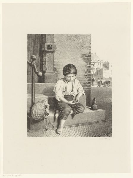 Editor: So, here we have Léopold Flameng’s “Child in a Chair with a Bowl in Hand,” an etching from 1853. It’s quite dark, and the child seems rather isolated. What do you see in this piece? Curator: I see a portrait, but more than that, a document reflecting 19th-century societal structures around childhood. Etchings like these were often commissioned or sold as domestic scenes. Look closely, and consider what is absent: a nurturing maternal figure, any semblance of play, of childlike joy. Instead, this child is still and somber. Consider also, the realism style that rejects idealized sentimentality. Editor: It definitely lacks sentimentality! Curator: Precisely. And this compels us to consider the sociopolitical implications. Who were Flameng's patrons, and what messages were they keen on conveying through their patronage? It hints at child labor or possibly mortality rates for children, which were major anxieties at the time. Also, observe the contrasts in shading—the depth seems significant to isolate the sitter. Why place them against the shadows of obscurity? Editor: That’s a fascinating perspective, considering the time period. I hadn’t considered it in the context of child labor or mortality, but that adds a whole other layer to it. It is unsettling. Curator: Indeed. It demands us to critically interrogate history through art. Perhaps the intent was for this depiction of quiet resignation to incite empathy and, potentially, even action. After all, representing such a marginalized figure compels us to reflect on their treatment in society. And if we look today, who is marginalized in contemporary society? Editor: Thank you. I see it differently now, viewing it with those additional perspectives. Curator: My pleasure, interrogating this work revealed so much for both of us!