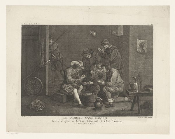 This print, made by Jean Charles Le Vasseur, depicts a brawl fueled by "Fureur Bachique," or Bacchic Fury, likely influenced by alcohol. The central figure is a man being restrained while seated, his face contorted in what seems to be drunken rage. Notice the jug and pots on the table; they are silent instigators of the chaos. Wine, as a symbol, has always teetered between sacred and profane, its consumption leading to both ecstatic experiences and, as we see here, primal conflict. This scene echoes the ancient festivals of Dionysus, where wine-induced frenzy blurred the lines between man and beast. The act of restraint, a motif of control versus chaos, appears in countless forms across art history, be it the binding of Laocoön or the frenzied figures in Renaissance bacchanals. It’s a visual representation of humanity’s constant struggle with its own impulses, a dance between reason and instinct that continues to play out in our collective psyche.