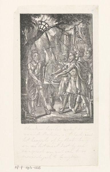 Curator: Here we have a drawing by Isaac Weissenbruch, likely created sometime between 1836 and 1912. It’s entitled "Groep soldaten de wapens in de lucht stekend," which translates to "Group of Soldiers Raising Their Weapons in the Air." It's currently housed here at the Rijksmuseum. Editor: The chaotic energy practically leaps off the page. The lines are so frantic, the details blurry, almost as if you’re caught in the middle of the frenzy yourself. The medium being ink creates a dramatic tonal variance that amplifies the raucousness. Curator: It's true that Weissenbruch captured a distinct emotional energy using those precise lines, contributing to the thematic tension within the framework of history painting traditions. The staging and costuming reference medieval period narratives that romanticize a particular version of warfare. It is interesting how these are reflected through the politics of his time. Editor: I appreciate your reading of its politics; I interpret the figures and the weapon themselves foremost, but that chaos is primarily delivered by the starkness of the line work. See how he abandons clean figuration for energetic strokes, especially in the background figures? And how even in the central figures the lines are etched to create a worn effect that might invoke emotional impact on an uneducated viewer. The use of starkly contrasting white negative space also draws my attention, creating the effect of something being highlighted in the overall compositional tension. Curator: While the lines may suggest chaos to a modern eye, that frenetic energy could have reflected the anxieties of a period undergoing immense societal change. Remember that during this period in the Netherlands there was a quest for the creation of a national identity as separate from the other colonial powers; history paintings offered a return to an idealized national, even mythologized, past. It's as much a comment on their present as it is a supposed depiction of the past. Editor: Your insights certainly shift my interpretation, grounding the frenetic energy within its historical moment rather than as a pure formal expression. Still, what a fantastic rendering, I appreciate how it gives an artist so strongly working in this tradition such latitude. Curator: I concur. There’s a valuable lesson in understanding how technical and historical context impact our engagement with a seemingly straightforward piece like this.