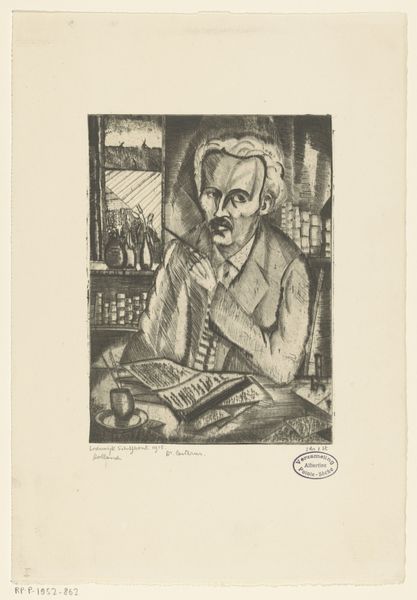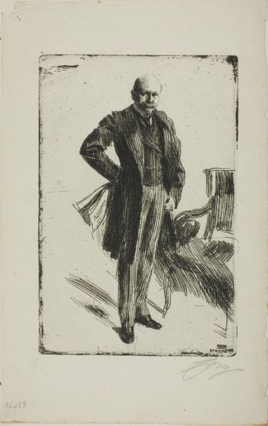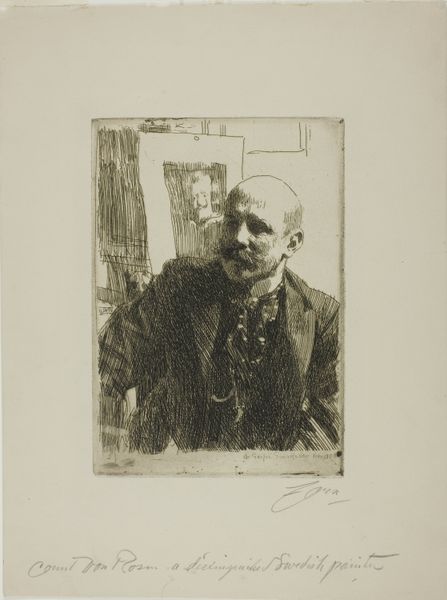 Curator: Here at The Art Institute of Chicago, we have Anders Zorn’s etching titled "Alfred Beurdeley," created circa 1906-1907. Editor: It’s a striking image. Immediately, I notice the almost ghostly quality given the monochromatic etching against the light paper; there's an undeniable sense of contemplation or even melancholy radiating from it. Curator: The sitter, Alfred Beurdeley, was indeed a prominent figure in the art world himself, a furniture designer and collector. Zorn, known for his society portraits, here presents Beurdeley in a very intimate setting, likely his own home, surrounded by the trappings of a cultivated life. Editor: Look at the books in the background! They speak volumes about Beurdeley’s intellectual and artistic pursuits. The way they're sketched suggests not just knowledge, but also an aura of personal history and memories connected to the printed word. It suggests a continuity of values being passed down to a refined taste. Curator: Absolutely. Zorn masterfully uses the etching technique to convey both detail and atmosphere. The lines are precise, yet they create a soft, almost blurred effect, drawing us closer to the subject. The portrait reveals much about artistic patronage and influence in early 20th century France. Editor: And the choice of rendering him in such detail, particularly his face, contrasts with the sketchiness of the background to truly guide our focus. It also suggests the social position; perhaps that one that dictates, for the public, the face of success versus the intimacy of private life. What do you think of the choice of medium for the artist’s sitter? Curator: That’s perceptive! Etching was a medium that allowed for wide distribution. Zorn likely envisioned this as a piece to circulate amongst a select, educated audience. By memorializing a figure like Beurdeley, he was solidifying his legacy and also making a statement about the cultural values he admired and shared with a prominent figure like Beurdeley. Editor: So true. The print becomes an artifact reflecting both Zorn’s artistry and Beurdeley's status, an intersection between individual artistic expression and broader social narratives. I look differently at its historical placement in the museum now! Curator: And I appreciate how you see the embedded psychology here. Ultimately, Zorn created more than just a likeness; he composed a statement on identity, artistry, and the subtle interplay between public persona and private intellect. Editor: It really underscores how a seemingly simple portrait etching can reveal complex layers of meaning when we consider the lives and times of both the artist and the sitter! Thanks, I see how much more complex it all is now!
