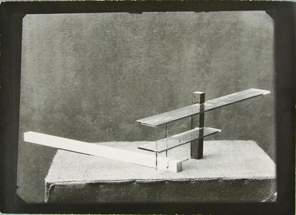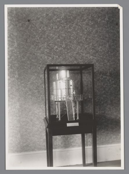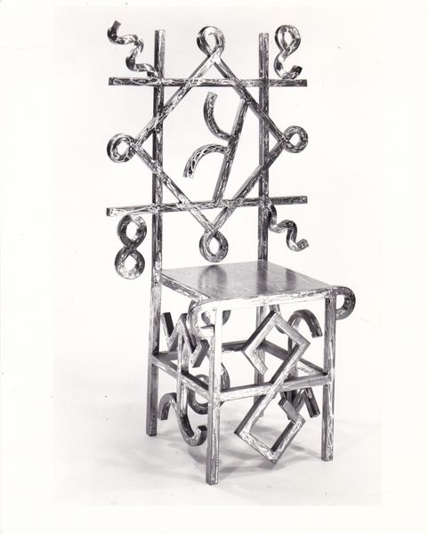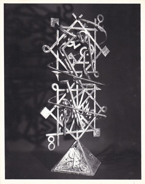 Curator: Looking at this, I immediately think of alchemy, a laboratory where transformations occur. Editor: We're looking at "Diamond = Mirror x K" crafted by Douglas Abdell in 1989, a sculpture constructed with metal. Curator: Metal, of course. It feels inevitable, doesn't it? Cold, hard... potentially quite sharp, too. Did metal working play into modernism? Editor: Absolutely. The use of industrial materials, processes of fabrication, and often a deconstruction of traditional sculptural forms were very popular. Artists pushed boundaries exploring the material capabilities of mass-produced metals and questioning the very definition of "art." I see that reflected here. Abdell employs industrial material not to mimic life, but to conjure a space for reflection. Curator: It’s undeniably striking. The pyramid base, the spiraling column, and then that diamond, almost like a window. It’s quite an enigmatic visual language. But what do you read from it? What stories does it tell you? Editor: Stories are embedded within it; layers of production history are literally melded into it. Metalworking requires specialized tools and a division of labor – someone designed this piece, someone else cut the metal, others assembled the final artwork. Curator: Thinking of labour brings the energy of the artwork to my mind; the fire, hammering, the precise manipulations required…it's there in its skeletal, gleaming form, even three decades later. There’s a very active quality that belies its static state. Editor: Precisely. It challenges the preciousness associated with traditional sculptures and connects it with production and wider economics. And if “Diamond = Mirror x K” suggests ideas of value, perhaps that extends to value as a process too? Curator: A mirrored window might reflect labour itself. Its transformation captured and crystallized... intriguing. The artwork certainly embodies transformation at different levels of visual experience! Editor: Yes, in its construction as much as its appearance. Abdell offers a study of not just modern materials but the human processes they go through. Curator: A perfect synthesis of art, work, and ideas!