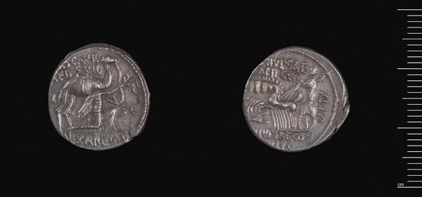 Curator: Here we have a Drachm of Demetrios Poliorketes, produced in Tarsos. Note the silver material and the weight of about 4 grams. What do you make of it? Editor: The stark silver against the dark background gives it such dramatic weight, even in this small form. The figures seem to be leaping forward. Curator: Indeed. Demetrios I, known for his military prowess, issued coins like this to broadcast his power and divine associations. The figure you see is Poseidon, god of the sea. Editor: The crisp lines and the muscular depiction give it such a sense of Hellenistic dynamism. Curator: Coinage served as propaganda. This piece visually links Demetrios to Poseidon, an essential message for a ruler aiming to control maritime regions. Editor: It's remarkable how much meaning is compressed into such a small object. I'm struck by its ability to convey strength through simple visual forms. Curator: It's a small thing, but powerful in its time.