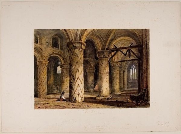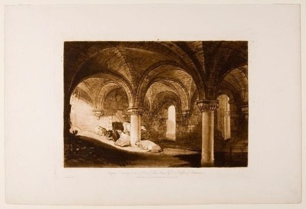 Curator: What strikes me first is how…peaceful it is. Even in this ruin. Editor: Yes, Turner captures that quietude beautifully in his print, "Crypt of Kirkstall Abbey." Kirkstall Abbey, dissolved by Henry VIII, became a powerful symbol for artists. Curator: There's such a sense of space, the arches leading on and on. But then, right there, those huddled sheep taking shelter! Editor: Exactly! Turner's showing us the cycle of history, how sacred spaces can be repurposed, and even revert back to nature. The light is key, too. Curator: It’s almost as if the abbey is breathing. The sheep seem completely at home, an odd kind of pastoral scene in a ruined crypt. Editor: The choice of sepia ink—brownish monochrome prints—speaks to a taste for antiquarianism and nostalgia in Turner's time. Curator: You know, thinking about it, Turner is gently reminding us that everything changes. The sacred becomes mundane, and then maybe beautiful again in its own way. Editor: Indeed, Turner’s ability to imbue ruins with such life points to why his work remains so relevant today.