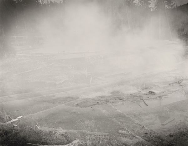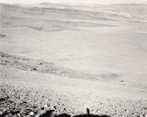 Editor: Here we have Lewis Baltz's "Looking Southwest from State Highway 248, 0.1 Mile East of Buffalo Bill Drive," a gelatin-silver print from 1979. I'm immediately struck by its starkness and the sense of almost desolate space. What readings does it suggest to you? Curator: Desolation is certainly a powerful initial reading. I see a landscape marked by intervention. Note how the tire tracks scar the foreground. The landscape is a repository of countless, often conflicting symbols. This piece invites us to consider how we assign meaning to the environment. Editor: So you’re saying the landscape isn’t just a neutral backdrop but is actively shaped by human activity? Curator: Precisely. Baltz directs our gaze to how roads and industry impact even seemingly untouched spaces, changing our memory of this landscape. Buffalo Bill, invoked in the title, once stood as a symbol of the romanticized West. By 1979, that symbol collides with stark industrial intervention. Do you feel a sense of loss here? Editor: Definitely. The monochrome palette amplifies that sense. It’s as if the image is drained of life. Curator: Yes, and in stark contrast to color landscape photography, that draining serves a specific purpose, turning the idealized symbol on its head, offering social critique. Editor: It’s fascinating how Baltz layers these visual and cultural elements. I hadn't considered the "Buffalo Bill" reference within the photograph itself. I now appreciate it more than just an uninteresting capture of the landscape! Curator: I agree. The symbolism transforms a seemingly straightforward photograph into a meditation on memory, industry, and the evolving American landscape.