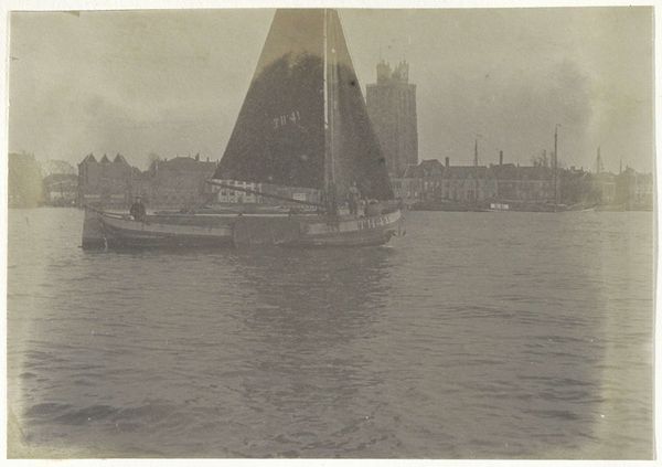 Editor: We are looking at Peter Henry Emerson's "Return of the Shrimpers" from 1887, a gelatin silver print. It gives the impression of a hazy, almost dreamlike scene of boats returning to port. How do you interpret this work, focusing on its photographic elements? Curator: Primarily, I see an exploration of light and texture. Observe how Emerson manipulates the tonal range to create a sense of atmospheric perspective, particularly the way forms dissolve into the background, emphasizing the pictorial quality over sharp detail. Note the strategic deployment of focus, which reflects Emerson's artistic theory centered around emulating human vision and its inherent blur. Editor: The lack of sharp detail is what stood out most for me. Is it a common trait? Curator: It is a considered strategy. Consider how Emerson challenges conventional photography of the period through his unique emphasis on form and the picture plane. The diffusion contributes to a flattened composition, further highlighted by the almost monochromatic palette. What effect does this visual strategy have on the photograph? Editor: I think the soft focus and limited tonal range draw my eyes into specific focal point. The strong presence of the ships at the forefront almost silhouetted. How else does composition guide the viewer? Curator: Note that by emphasizing spatial ambiguity through these dark and blurred foregrounds he creates the illusion of depth while maintaining attention to the surface pattern, disrupting the illusionistic potential inherent in photography. The formal and representational converge. The picture asks us to examine the fundamental conditions and capacities of its creation, blurring reality into aesthetic abstraction. Editor: This gives a new appreciation for the composition itself and also the aesthetic decisions guiding it. I initially saw the work for its literal portrayal of returning shrimpers, but now, focusing on light and visual ambiguities provides a totally fresh understanding. Curator: Exactly, focusing our analysis on the compositional aspects opens an entirely new discourse! It is a visual game for the observer to engage.