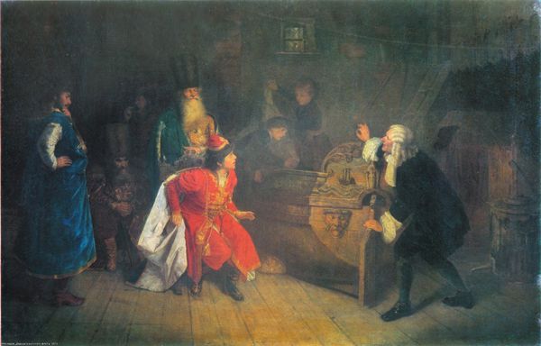 Jehan Georges Vibert created this painting titled 'The Sick Doctor'. The painting's composition is anchored by a theatrical contrast, where the vibrancy of the doctor’s attire sharply opposes the languid pose and dark clothing of the patient. Vibert uses the interplay of diagonal lines, particularly in the patient’s slumped posture and the doctor's attentive stance, to create a sense of dynamic imbalance and unease. The rich colour and ornate costumes seem to satirize the formal aspects of 19th-century representation. The painting questions established forms of medical authority. The semiotic system at play subverts the expected codes of health and wellness. Vibert’s formal rendering of the scene is both aesthetically engaging and rich in cultural critique. He reminds us that artworks function within broader systems of meaning, constantly challenging us to reconsider our perceptions of truth and representation.