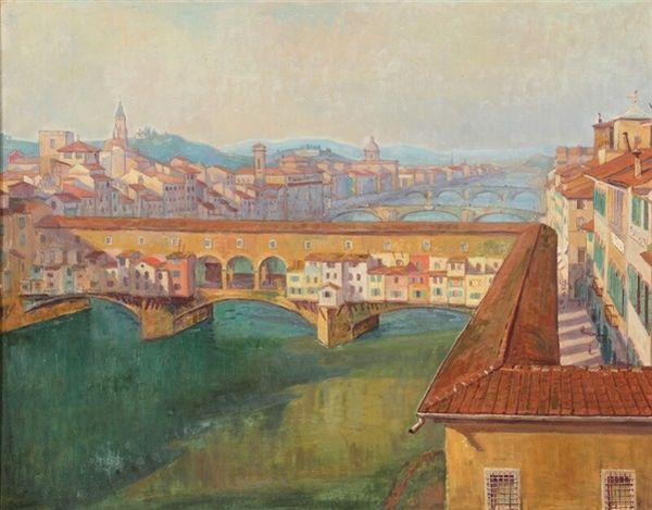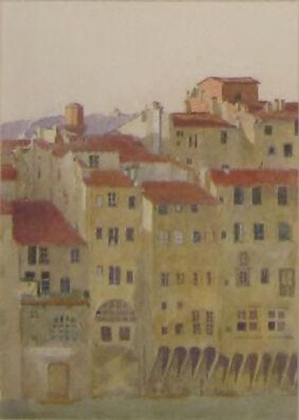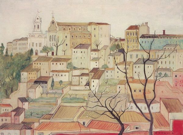 Editor: So, here we have Konstantin Gorbatov's painting, "Roofs. Venice," an oil on canvas. The texture seems so tactile, almost like you could reach out and touch those sun-baked tiles. What strikes you most about its composition? Curator: Initially, I’m drawn to the masterful interplay between horizontal and vertical elements. Note how the dominant horizontality of the roofs is punctuated by the assertive verticals of the chimneys and, more distally, the bell tower. This interplay creates a dynamic visual rhythm. Editor: That’s a great point about the rhythm. The colours are mostly muted but feel rich with so much light. What would you say about Gorbatov’s use of color and light? Curator: Precisely. Consider how the artist modulates colour to define form and space, with the light seemingly dissolving the solidity of the architectural structures. Observe the nuances within what you’ve termed “muted” colours; subtle variations in tone and saturation are critical to establishing spatial depth and aerial perspective. How does that inform your reading? Editor: It feels almost ephemeral. That subtle use of colour certainly enhances the feeling of receding space. Does this kind of Impressionistic cityscape normally highlight those sorts of feelings, or do you think Gorbatov's doing something new here? Curator: In essence, "Roofs. Venice" epitomizes the formalist ambition to reveal truth through the artist's aesthetic vision. It also underscores the objective analysis of its compositional structure as it speaks volumes on this atmospheric cityscape. The interplay of planes, color, and light elevates what might seem mundane into a celebration of pure form. I now better grasp this picture with aerial perspective. Editor: That's a helpful reminder of the power of pure form. I am going to pay closer attention to structure when appreciating cityscapes.