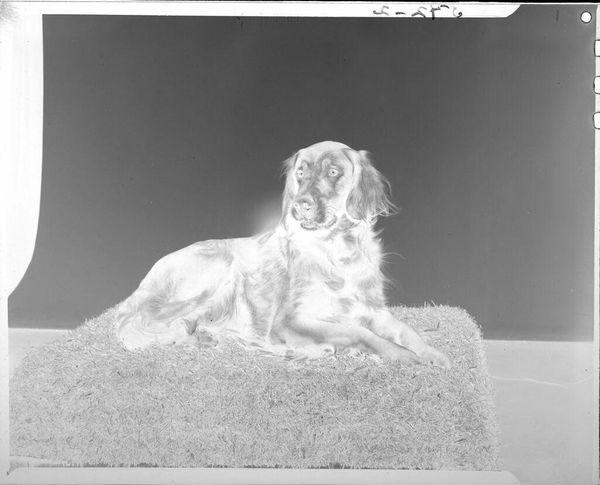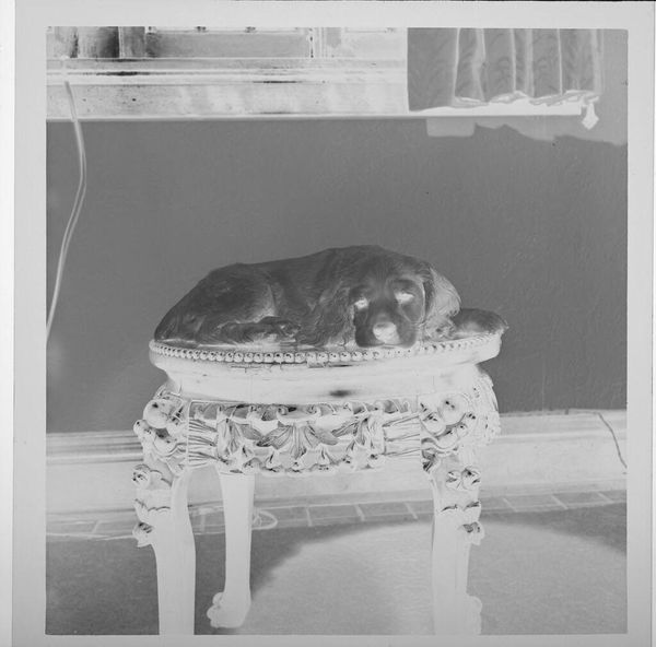 Editor: This is Jack Gould's small, undated photograph, *Untitled (dog seated on table)*. The dog's melancholy pose feels very poignant. What symbols or hidden meanings do you perceive? Curator: The dog, elevated on a decorative table, might symbolize domesticity and loyalty, elevated almost to an idol. Is it a celebration or a critique of that relationship, I wonder? Editor: Hmm, I hadn't considered it as possibly a critique! Thanks for making me think differently. Curator: The power of symbols is their versatility, their ability to be interpreted in myriad ways, changing over time. That is what makes them so compelling.