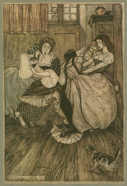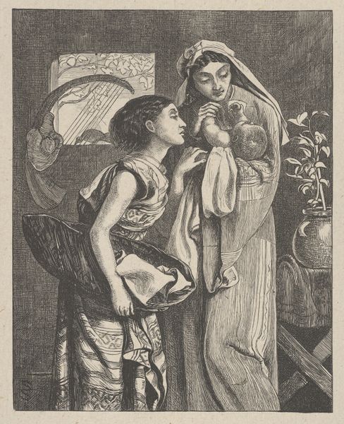 Curator: What strikes me immediately is the overall somber, protective mood; it feels charged with symbolism and a certain nationalistic fervor. Editor: You've got a good eye! This is a 1917 watercolor illustration by Maurice William Greiffenhagen entitled "Woman with Sword Embracing Two Children." It appears to be a print as well. He seems to position the image of the nation-state as both powerful and intimately nurturing. Curator: Exactly! The sword isn't merely an emblem of aggression; it stands for sovereignty, duty, perhaps even sacrifice. The children represent the future of the nation, their vulnerability in contrast to the maternal figure’s strength is palpable. What cultural narratives might be informing the visual vocabulary here? Editor: It evokes classic images of maternal figures from antiquity, re-imagined. Note the attire; it's both contemporary and classical. The colors are potent visual signifiers too. Red, white, and blue, strongly associate this piece with patriotism. But observe how somber these colors are—almost as if tempered by grief. Curator: Right, it is not mere nationalistic pride but a solemn charge of safeguarding cultural identity through tumultuous times. Look closer, the architectural beam at the top almost appears like a stage set, giving the whole composition a theatrical character, but more importantly drawing from established iconography of heroism and valor. The children's garb looks distinctly like European peasant styles. It’s an interesting layering of symbolic tropes! Editor: Interesting observation about the theatrical staging. It does lend the artwork a grand narrative. It also resonates with the tradition of using art for public persuasion or mobilization, typical in times of conflict. So the watercolor's seemingly humble medium carries an almost monumental weight, in part through its very knowing construction through established symbols. Curator: Precisely. Considering the era in which it was created, amid global conflict, it's a clear instance of political mobilization and use of archetypal forms to stir emotive responses, reinforcing shared cultural ideals under peril. Editor: Indeed. It is more than a snapshot of war time; it functions almost as a memorial itself, attempting to distill a specific collective experience in response to times of turbulence, into symbols that ensure enduring recognition. Curator: A valuable reminder that, even within seemingly gentle watercolor illustrations, lie entire political and social narratives clamoring for a voice! Editor: Agreed, let’s keep seeking those whispers buried within plain sight.