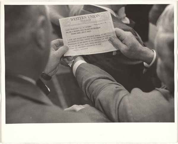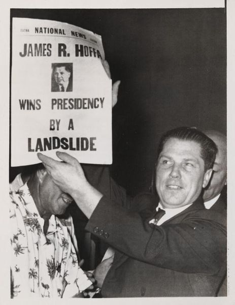Editor: Here we have an Associated Press photograph of James Riddle Hoffa, Teamsters' President, taken in 1957. The image captures Hoffa being carried on the shoulders of jubilant supporters. It feels incredibly staged, almost like a Roman triumph. What do you see in this piece beyond the obvious celebration? Curator: Well, I see a carefully constructed image meant to project power and legitimacy. Consider the context: Hoffa's rise was controversial, shadowed by allegations of corruption. This photo, disseminated by the AP, serves as a powerful piece of propaganda. Editor: So, it's less about genuine celebration and more about solidifying his image? Curator: Precisely. The performative nature of the image, the wide distribution through the Associated Press, it all points to the manipulation of public perception, an attempt to sanitize a complicated figure. The image freezes a moment of carefully orchestrated triumph, obscuring any underlying tensions or controversies. Editor: That reframes everything! I was focusing on the apparent joy, but it's really about image control. Curator: Exactly. By understanding the socio-political climate, we can see this photograph as more than just a victory shot. What do you take from that? Editor: I now recognize the importance of looking beyond the surface and considering the historical forces shaping the image itself.