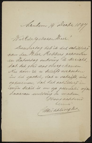 Editor: So, this is "Brief aan Philip Zilcken" by Edouard Taurel, likely from 1892 or 1893. It’s ink on paper, a letter really. It feels very personal, but the handwriting is so stylized it almost feels performative. What catches your eye here? Curator: The act of writing itself carries deep cultural significance. Before mass communication, letters were precious objects. The flowing script becomes a visual symbol, a signifier of intimacy and intent. The consistent line weight suggests deliberation, a commitment to conveying respect. But does that align with the message of the letter? Do we know Zilcken's status relative to Taurel? Editor: I see your point. It could be a professional communication, stylized for the period, not necessarily deeply personal. The slant of the script almost seems to lean towards formality, as though bowing to convention. Curator: Precisely! Note the flourishes – these aren’t merely functional, they signal education, social standing, a visual language instantly recognizable to its recipient. The letter is a carefully constructed image. In that context, do the content of the letter and the visual styling reinforce each other, or do they clash? Could there be a subtle layer of irony here? Editor: That's fascinating! I hadn’t considered how much a simple letter could convey beyond just its words. I thought calligraphy was simply beautiful but understanding the hidden messages makes it more so. Curator: Indeed! The symbols may be subtle, but the image speaks volumes about power dynamics, cultural expectations and individual expression. Each carefully crafted stroke connects us to a past where handwriting was a primary form of identity. Editor: I definitely have a new appreciation for the power of handwriting. It's like a fingerprint of the soul almost. Curator: A carefully posed one, perhaps. And that’s the artistry!