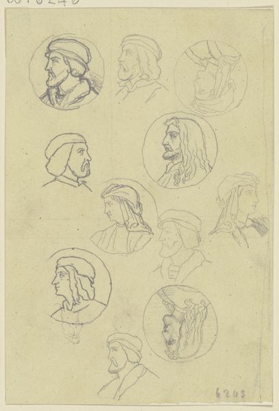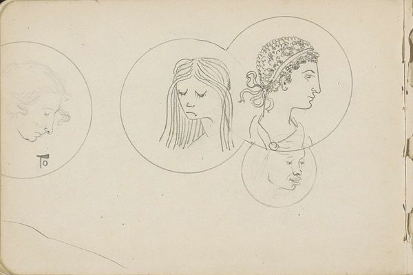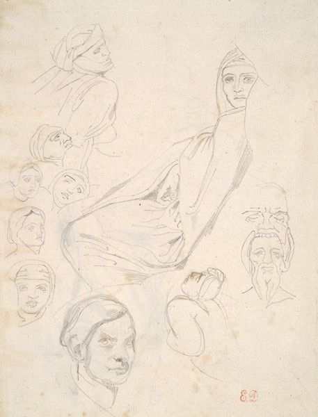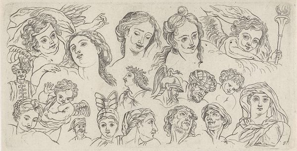 Curator: Looking at this pen and ink drawing, I see an echo of countless fashionable women staring back. It's like a botanical study, but instead of plants, it's all hats and hairdos. Editor: You're right; there's something regimented and yet also lively about the composition. It makes me think of a sampler, the kind young women used to practice their needlework, but here, the craft is fashion itself. Curator: The artist, Bernard Picart, created this in 1703. It’s titled, in Dutch, "Fashion study with various positions of heads and hats". The Rijksmuseum has this delightful example of a genre scene drawing. The delicate pen strokes and the ink bring them to life, giving them this lightness of being that still feels quite relevant to this day. Editor: It certainly evokes the performative nature of high society! I'm struck by how Picart captures the attitude suggested by each hat. Hats, historically, have been powerful signals of identity, and it’s as if each tilt of the head is revealing something of the wearer's social aspirations. Curator: Definitely, but to me it is like they have secrets to whisper in the shadows, or maybe naughty giggles at a party, even a lover’s dark glare for certain people in the group. The symbols he used here are beyond our scope, but back then, everyone knew that hats expressed who they are and also gave out a lot about people who were looking at it from the outside. Editor: Exactly! These aren't just fashion accessories; they're carefully constructed pronouncements of social status and personal narrative. Think about the head coverings that denoted religious affiliations or marital status, as well. The head, literally and symbolically, bore the weight of social expectation. I feel a deep connection with women in history thanks to this. Curator: Thinking about how easily accessible fashion has become, this makes me miss simpler times where everyone around the city was wearing hats and where, whether they know it or not, artists were writing whole essays through clothes. I wonder what Mr. Picart is thinking. Editor: He definitely caught a specific cultural moment there! Hats were certainly saying so much more. Curator: This drawing encapsulates how attire speaks volumes without a single spoken word. Editor: It is a symphony of symbolic visual communication. Fascinating!