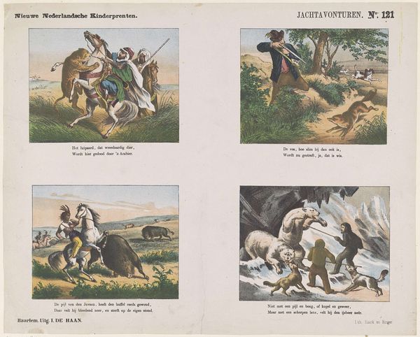 This color print titled 'Het buitenleven', or 'The Outdoor Life', was created by Jan de Haan, and offers us a glimpse into the idyllic world of childhood in the Netherlands. Divided into four scenes, the print presents snapshots of children interacting with nature and animals, each accompanied by a short verse. These scenes reflect the values and ideals of the time, emphasizing the importance of innocence, play, and connection with the natural world. Yet, they also reveal a structured social hierarchy where childhood is carefully managed and innocence is clearly gendered. Notice the contrasting depiction of children's activities: some are gently observing birds, while others are struggling to control a donkey. These moments capture the complex ways in which children's experiences are shaped by both freedom and constraint. The print evokes a sense of nostalgia for a simpler time, yet it also invites us to reflect on the ways in which childhood is constructed and experienced differently across time and cultures. In doing so, it highlights the emotional and personal dimensions of growing up, and the societal forces that shape our understanding of innocence, freedom, and belonging.