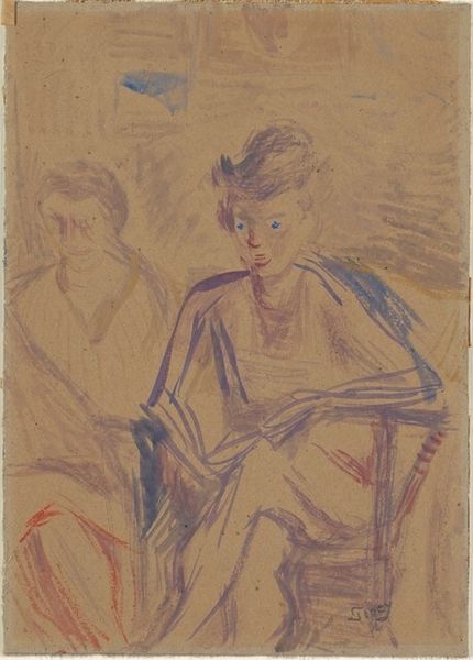 Editor: Here we have Henri de Toulouse-Lautrec's "L’Argent" from 1895, created with pastel on cardboard. It’s got this very ephemeral, fleeting feel to it with the quick, suggestive lines. What do you make of this intriguing piece? Curator: Well, given Lautrec's focus on depicting Parisian nightlife and the commercial entertainment industry, particularly figures from marginalized communities, "L'Argent"—money—speaks volumes. We see two figures, possibly a performer and her patron. The lack of detail blurs identities but throws the spotlight on the socio-economic dynamic that fuels these performances. Who profits? Who is exploited? Editor: So the title directly relates to the transaction occurring, or potentially occurring, between these two figures? Is that part of the point? Curator: Absolutely. Consider how easily these women were painted into society's fabric but had little power or recognition. How the burgeoning art market often ignored the reality of who owned the "means of production." Lautrec gives us access to these backstage areas. Do you think his viewpoint here is celebrating or critiquing the system? Editor: It's hard to say. It feels very intimate, yet there is a definite separation, perhaps distance even, despite their proximity. It seems he acknowledges their presence without passing judgment. It makes you think about what power dynamics were at play here and makes me think it might even be both at once: acknowledging but not ignoring? Curator: Exactly! It invites that discussion. It reminds us art isn't created in a vacuum but reflects larger societal forces. We, as viewers, play a role in determining its future trajectory and what it symbolizes for us. Editor: This has made me look at Lautrec in a whole new way; I didn't realize how much the title contributes to shaping our understanding and how vital art's position is as a cultural reflection. Curator: And it's how engaging with the past allows us to comprehend the inequalities that persist today and what shifts are now happening regarding these long-term topics.