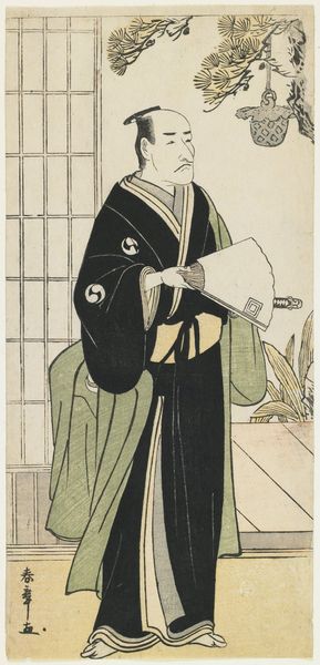 This woodblock print of an unidentified actor with an open fan was made by Katsukawa Shunko. The fan, a seemingly simple object, holds layers of meaning. In Japanese culture, it symbolizes status and is integral to Noh theater, where specific fan movements convey emotions and narrative elements. Consider the ancient Greek chorus, whose gestures shaped the emotional landscape of tragedy, or even the fluttering fans in a Rococo painting, each expressing hidden desires. The fan is not just an object; it is a vessel of intention, a tool for controlled self-expression, hinting at concealed depths. Here, the actor's averted gaze suggests introspection, perhaps a moment of vulnerability before returning to his performed role. Like a mask, the fan hides as much as it reveals. In this theater of the self, the actor engages in a symbolic dance, inviting us to ponder the masks we wear and the complex emotions we carry. This is the eternal return of the image!